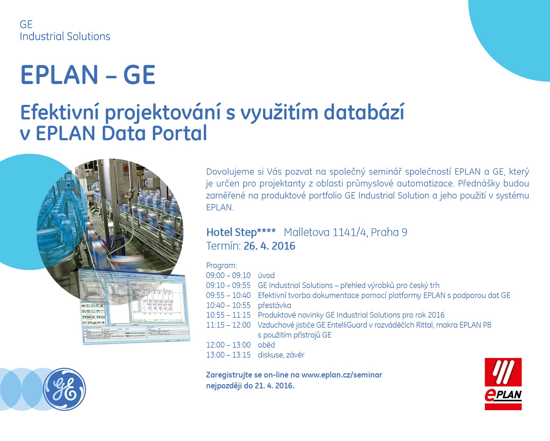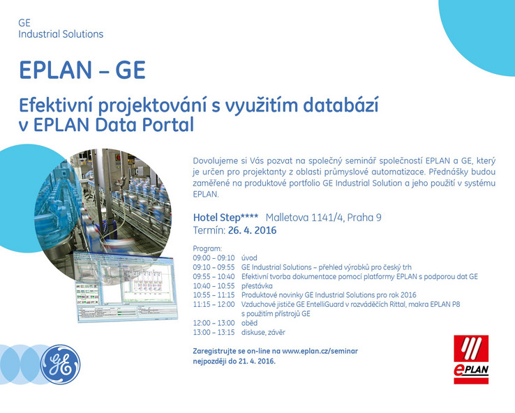 Efektivní projektování s využitím databází v EPLAN Data Portal Dovolujeme si Vás pozvat na společný seminář společností EPLAN a GE, který je určen pro projektanty z oblasti průmyslové automatizace. Přednášky budou zaměřené na produktové portfolio GE Industrial Solution a jeho použití v systému EPLAN Termín: 26. 4. 2016